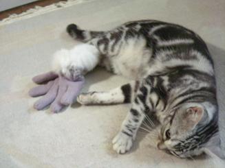 猫は遊び好きということで、うちのルチルさんもよくおもちゃで遊んでいます。特にお気に入りなのがねずみのおもちゃ。釣竿みたいな棒と糸の先に、ネズミの人形がくっついているというものなのですが、この人形がウサギの毛皮でできていたりして、なかなか本格的なものです。天然毛なので、猫の狩猟本能が刺激されるとかなんとか。しかしルチルさんの場合、この狩猟本能が刺激されすぎてしまっているのか。人が見ていないと、口のなかにネズミを突っ込んでくっちゃくっちゃ。気づいて急いでおもちゃをとりあげると、ルチルさんの口の中から、よだれでべちょべちょになったネズミさんが……。本来このおもちゃ、人が棒の部分を持ってねこじゃらしよろしくゆらして遊ばせるものなのですが、ルチルさんはどうして賢いようで、おもちゃの隠し場所を探し当ててはくちゃくちゃ勝手に口に入れてしまいます。もう少し、うまい隠し場所を探そうと思う今日この頃です。