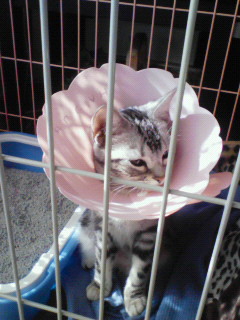 手術した犬猫がよくつけている、噂のエリザベスカラー。傷口を舐めないようにという配慮の品なのですが、ルチルさんはご不満だったようで、顔が少し怖いです。一生懸命はずそうとしていました。